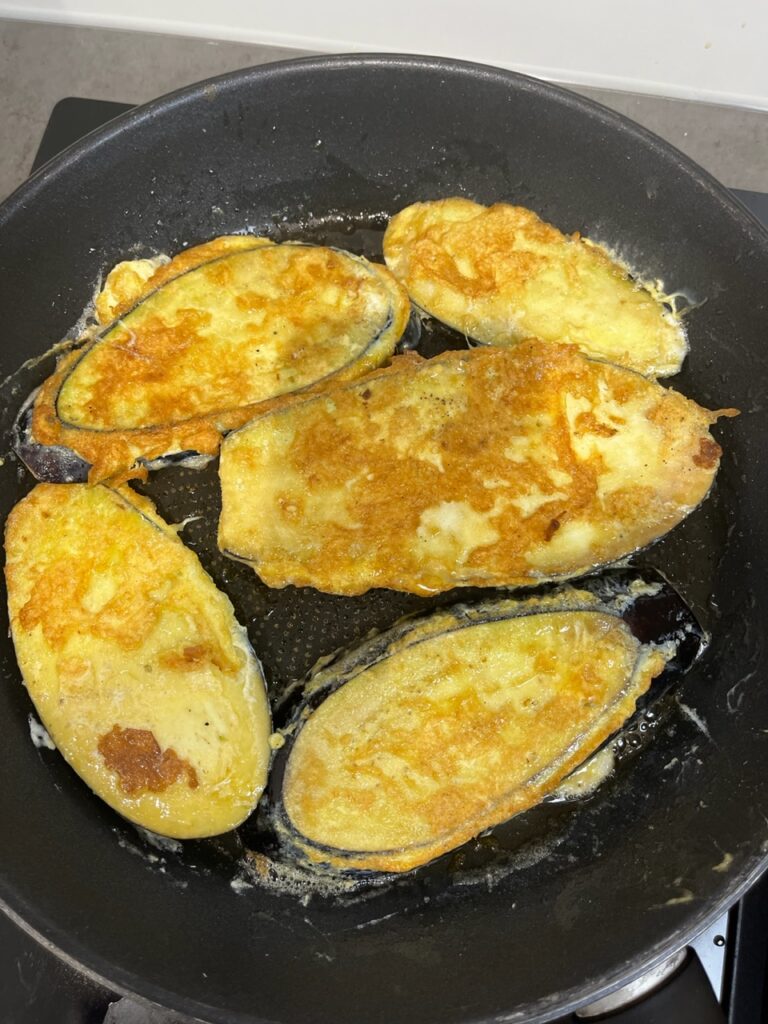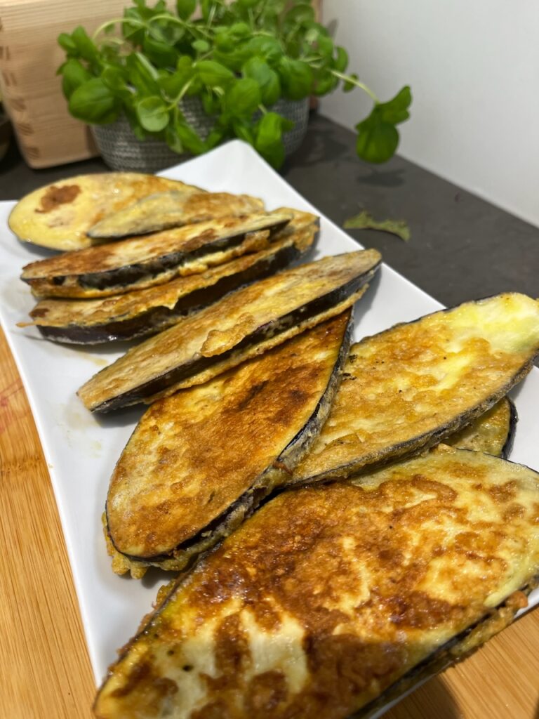 Auberginen in Scheiben schneiden, leicht salzen und mit Zitronensaft marinieren. Danach in Mehl und verquirltem Ei wenden und in reichlich Olivenöl goldbraun braten. - Tomatensauce kochen: