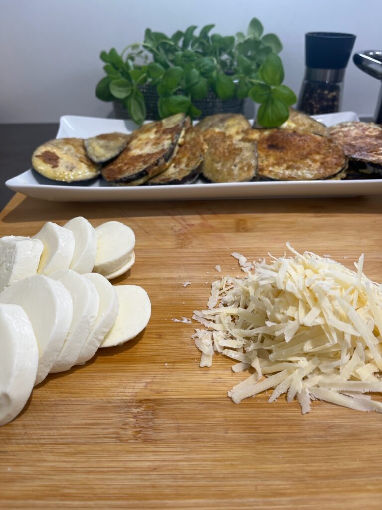 In eine Auflaufform zuerst etwas Tomatensauce geben, dann gebratene Auberginen, Mozzarella, Parmesan und frische Kräuter schichten. Vorgang wiederholen, bis alles aufgebraucht ist. Zum Schluss großzügig mit Käse bestreuen. - Überbacken: