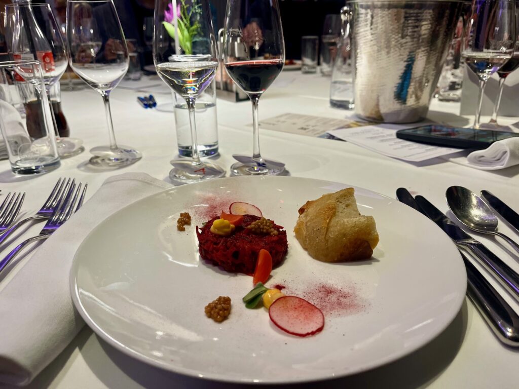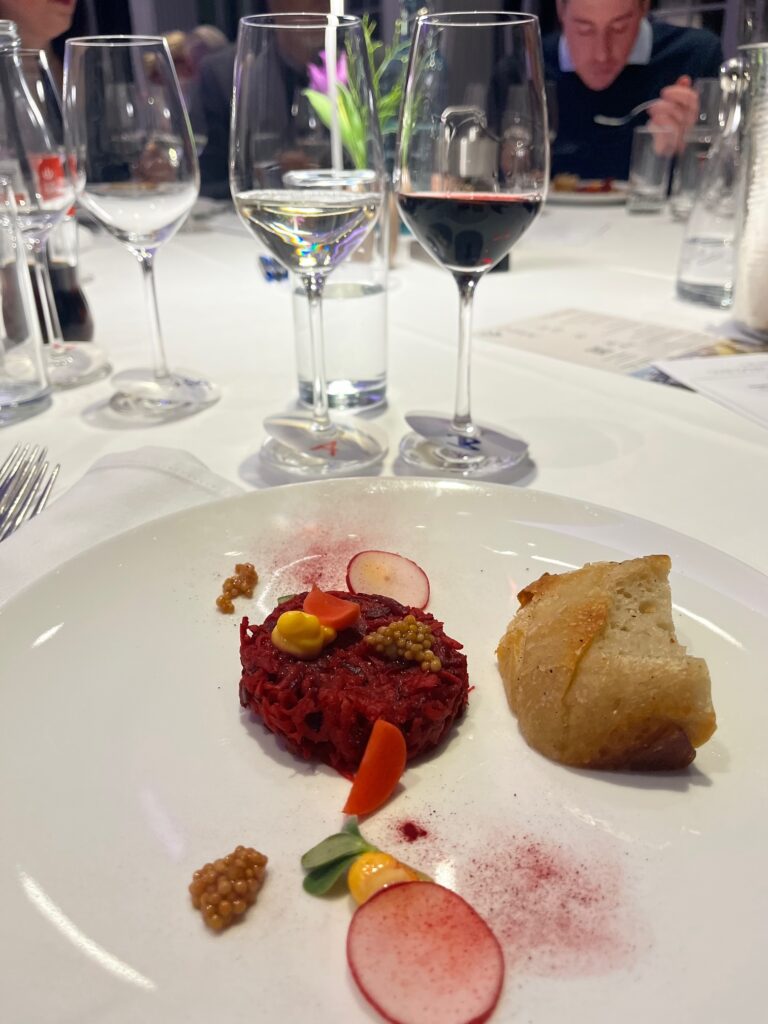 Gleich beim ersten Gang – einem vegetarischen „Beef Tatar“ mit Dottercreme und vegetarischem Kaviar – setzte sich der Pinot Blanc 2025 vom Nepomukhof knapp gegen die Cuvée Q2 2024 von Horst Gager durch. Mit 13 Stimmen Vorsprung ging Göttlesbrunn mit 1:0 in Führung.