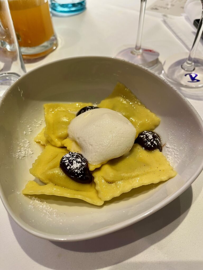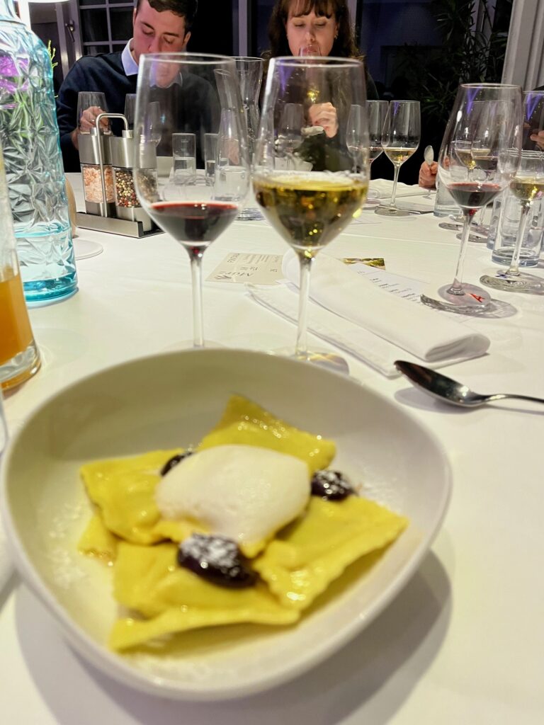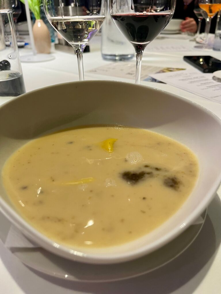 Auch die zweite Runde zur Selleriecremesuppe mit Trüffelpesto und Ravioli entschied Grassl mit seinem Chardonnay 2025 hauchdünn gengen den Blaufränkischen Classik für sich. Exakt eine Stimme Unterschied bedeutete das 2:0 für den Nepomukhof.