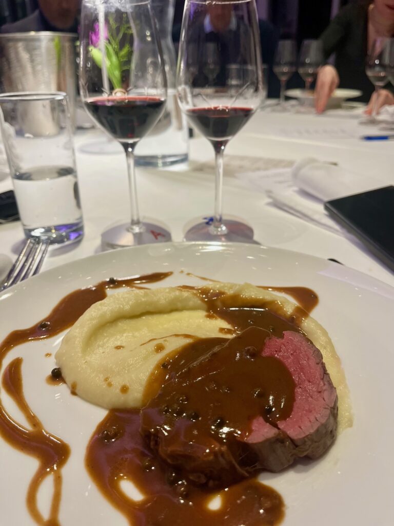 Spannend blieb es dennoch: Zum rosa Rinderfilet auf grünem Pfefferjus und Topinambur punktete Horst Gager mit seinem Blaufränkisch Mitterberg Reserve 2021 und verkürzte auf 1:3.